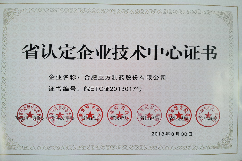 立方制藥 省認(rèn)定企業(yè)技術(shù)中心 證書